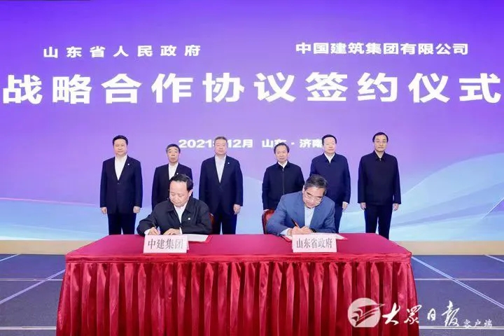 12月3日下午,山东省人民政府与中国建筑集团有限公司在济南签署战略合作协议。山东省委书记李干杰,省委副书记、省长周乃翔,中建集团党组书记、董事长郑学选出席签约仪式。山东省领导刘强、曾赞荣;中建集团党组成员、总会计师王云林,党组成员、副总经理马泽平、周勇参加活动。